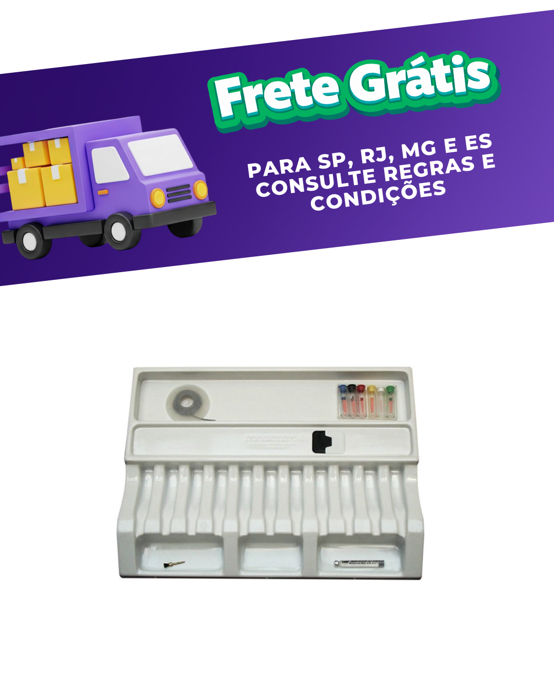 Bandeja odontológica 30212 - Magnum, gaveta odontológica multi-uso, de poliestireno de alta resistência, medindo 40x30 cm, disponível na cor branca. Prática e fácil de limpar. Possui 5 nichos retangulares em diversos tamanhos e 11 nichos alongados. Feita com dupla laminação, o que aumenta a resistência a materiais corrosivos.
