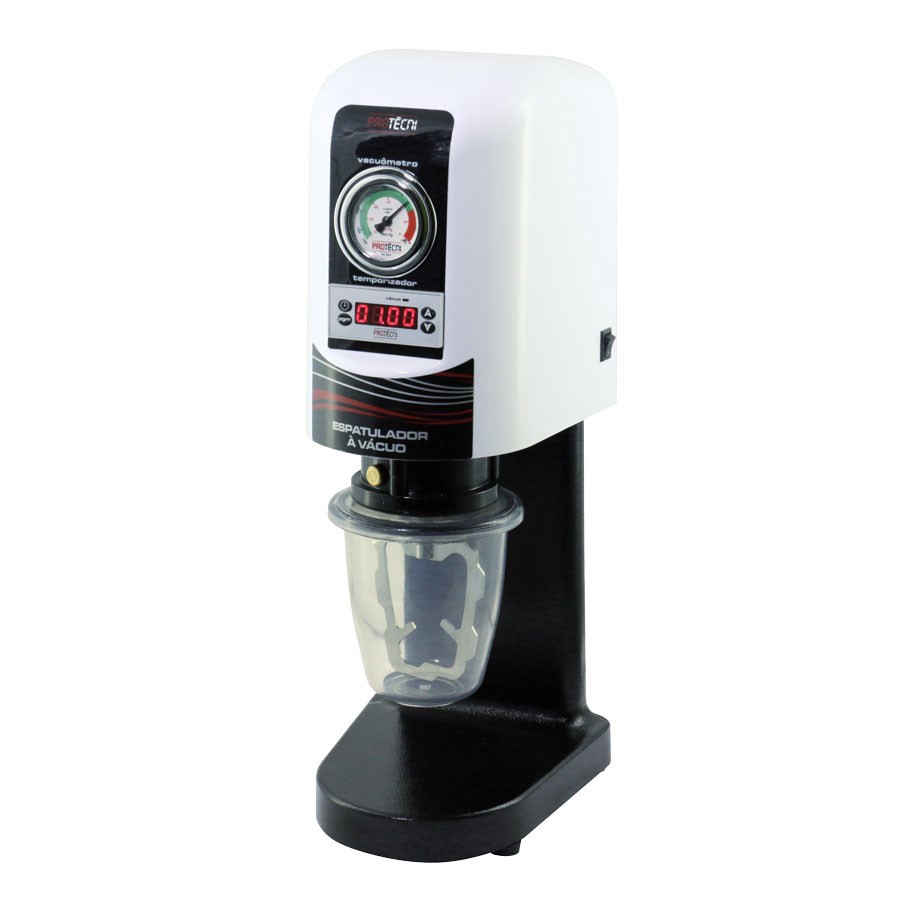 O Espatulador á Vácuo PROTÉCNI é utilizado para mistura, homogeneização e retirada de bolhas por vácuo em revestimentos odontológicos entre outros através de um motor potente e uma bomba de vácuo silenciosa. Fácil operação indispensável em qualquer laboratório. Afixação da cuba ao equipamento durante a espatulaçâo é feita por sucção tornando a operação simples e segura. Sistemas de filtros eliminam as impurezas que por ventura possam prejudicar o bom funcionamento da bomba a vácuo. O Desenho da cuba e espátula de mistura proporcionam uma perfeita homogeneização e retirada do ar (bolhas) do revestimento.